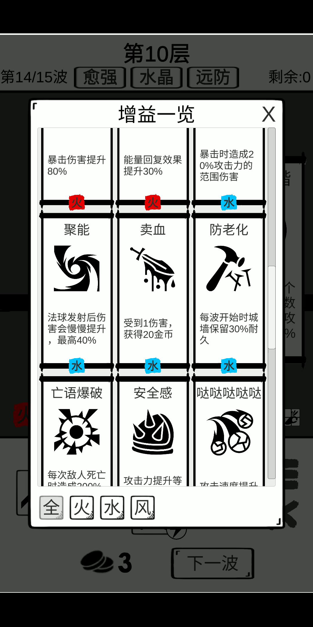 这游戏让我看到了科技和生产力的重要性,以及进一步理解了量产到质变的道理。 现在这阶段,能拿蓝色拿蓝色,有了生产力,才好办事。 然后呢,散射现在这层还能用,不知道再往后行不行。 最强的永远不是boss,而是背景是盾的那个怪,丫的一A出来我建的五十多血的墙一枪给我撸没了,心痛,这玩意可以用加固来挡,没CD的话就只能心疼一下墙了。
