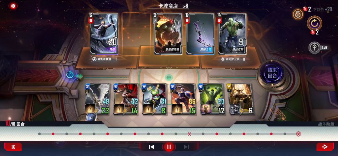 最终阵容:①索尔蛙②科恩格③海姆达尔④瓦尔基里⑤奥丁⑥沃斯塔格瓦尔基里站4号位保证行动的时候可以复活海姆达尔,科恩格耐打型的,战力也有保障,索尔蛙和沃斯塔装上雷神之锤,海姆达尔装美队盾,奥丁和瓦尔基里装激光双枪。第一回合买一个怪升本,第二回合升本,卖点血没事,后面正常买怪,稳定下来直接上6