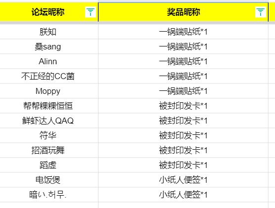 大家好,感谢大家积极的参与本次活动,现将活动中奖名单公布如下↓,没中奖的友友请不要气馁,多关注论坛最新活动公告,祝大家游戏愉快。恭喜以上玩家获得活动奖品,请于8月18日11:59之前主动添加并联系工作人员登记。工作人员扣扣: 3297521311提供中奖信息(按空间格式提供信息),以防因QQ离线漏掉信息,麻烦各位中奖的玩家一直联系到工作人员回复 已登记为止哦,如未在规定时间内未有效提供信息将视