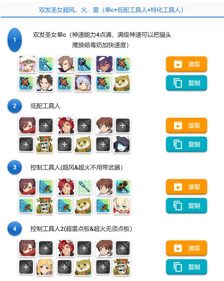 增加了礼机和雷魔女的超水踢罐盘。关于礼机踢罐盘,由于只有超水和超暗fever条相对较短,适合礼机出场;另外礼机自身加成也不是很高(只是略高于丛云),所以并没有把带有礼机的超风、超雷和超暗的踢罐盘放出来。这里汇总了一些本人能组的,用起来舒服或者低配易组的auto踢罐盘(大多数不含限定),并给出了工具人盘的示例。圣女六属:神速能力四要求点满,工具人一般需要顿足或麻痹延长bk的时间。超风、雷、水、