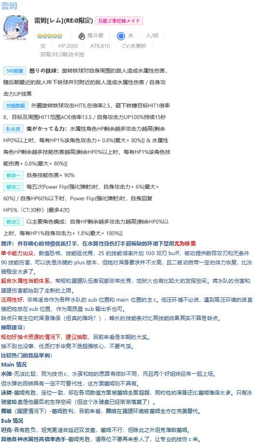 原帖是大佬发布在NGA的攻略贴,个人在使用过程中受益颇多,申请搬运到taptap供大家使用。不做任何商业用途,如有侵权,我会立即删除本帖。原帖地址为:[攻略心得]2021.01.16-卡池快评:re0联动卡池(蕾姆、爱蜜莉雅、拉姆、莱月昴)新角色快评主要还是在群里消化掉了一些,所以才顺手分享向nga个人编辑,观点应该还是不够全面比如莱月昴,棺材对轴我暂时真的想不到思路...却总感觉有一定