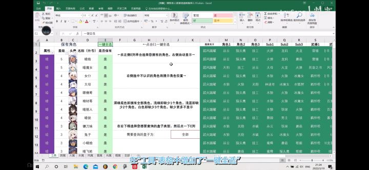 演示视频:https://b23.tv/r0IldPc下载链接见视频介绍【简介】电脑端Excel 2010以上可用,完整功能建议启用宏。开启后通过点选拥有的角色,即可自动生成可组的盘子。目前约每半个月、大型活动更新时会同步更新。3.19日更新内容:1、更新一键全选功能2、增加“全部”选项全部数据表为自动生成,包括前七个数据库共100余条数据。无宏可以在此表中使用查找功能3、新增“找