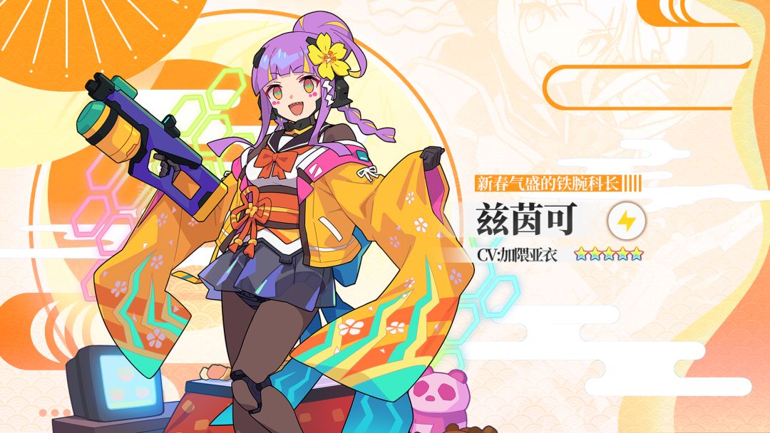 TriMinutes特别技术处理科科长。手段强硬,充满朝气,最喜欢自己的团队和伙伴。正因此,她在新年做出的第一番事业便是设立“特别技术处理科涩谷支部”。 ✦ 属性:雷 ✦ 类型:射击 ✦ 技能:枪火礼炮 向距离最近的敌人发射充能激光炮,对命中的敌人造成雷属性伤害/赋予自身攻击力提升效果/赋予队伍强化弹射伤害提升效果 “呀哈哈哈——新年快乐~! 另外,特别技术处理科涩谷支部成立了! 一切都包在我兹茵