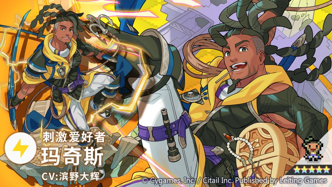 【角色档案】刺激爱好者「玛奇斯」 (CV:滨野大辉) 无比热爱刺激体验的大海世界中的宝藏猎人。以“刺激爱好者”的名号闻名于同行及海盗之间。 ✦ 属性:雷 ✦ 类型:剑士 ✦ 技能:战栗雷光 一边突进一边对前方使出斩击,对命中的敌人造成雷属性伤害 “我是宝藏猎人玛奇斯。 不过,其实我真正追寻的东西 不是宝藏而是惊险刺激的体验啊!” 「新角色特选扭蛋」限时进行中!