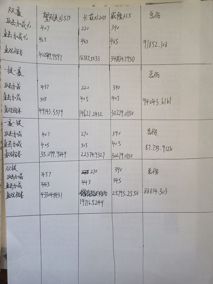 关于暗直击的珠子选择ing首先说一下 暴是暴食之枪提是提尔锋 并且这次计算的伤害都是加成效果拉满时的伤害从图上看出 貌似1提1暴是最优选(?)毕竟卡菈用提尔锋提升太小了 自身攻击加成太低 反而用来延长贯穿时间的威龙自身攻击加成高(因为威龙玛纳板有个效果是延长加强效果时间 所以我把奥库斯给他了😖😖😖)我们把卡菈的武器和珠子和威龙调换 在看伤害就可以知道.....诶我还没算呢 算这东西比较麻烦 大家给我一些时间呢