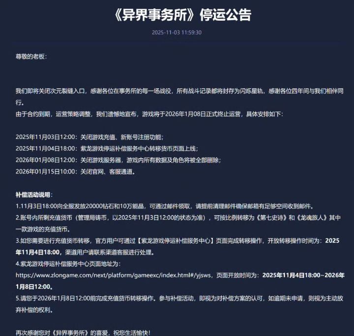 🚨四年陪伴终落幕:《异界事务所》官宣停服,紫龙代理首款停运二游谢幕🚨🤔11月3日,紫龙游戏正式发布公告,宣布代理的《异界事务所》国服将于2026年1月8日终止运营,目前已关闭新账号注册与充值功能。✅️这款曾以"CLike良心作"标签圈粉无数的二游,最终未能扛过市场考验,成为紫龙代理产品中首款停运的作品,为四年运营画上句点。✅️作为紫龙代理的首款停运二游,此次停服也暴露了海外代理的固有难题。🤔