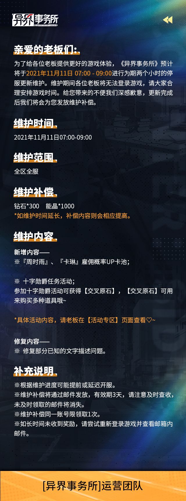 《异界事务所》11月12日维护公告