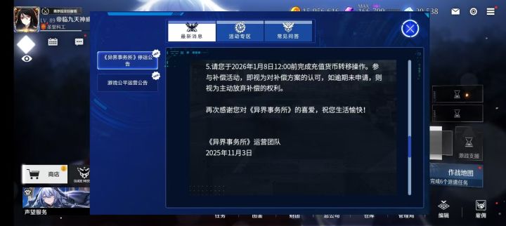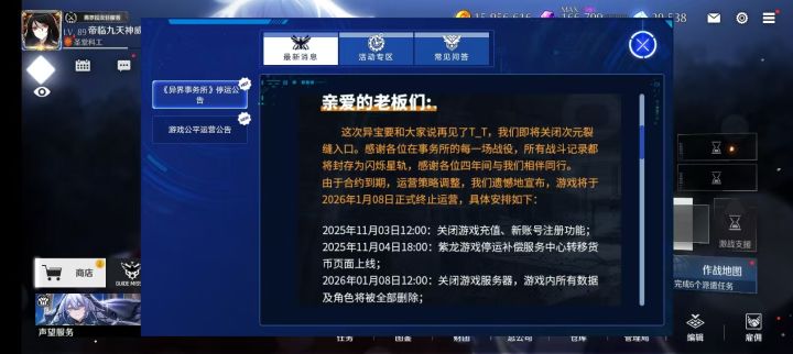🚨四年陪伴终落幕:《异界事务所》官宣停服,紫龙代理首款停运二游谢幕🚨🤔11月3日,紫龙游戏正式发布公告,宣布代理的《异界事务所》国服将于2026年1月8日终止运营,目前已关闭新账号注册与充值功能。✅️这款曾以"CLike良心作"标签圈粉无数的二游,最终未能扛过市场考验,成为紫龙代理产品中首款停运的作品,为四年运营画上句点。✅️作为紫龙代理的首款停运二游,此次停服也暴露了海外代理的固有难题。🤔