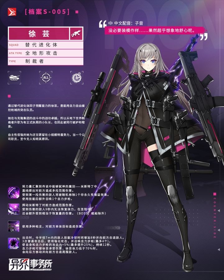 老板,晚上好,今日我来酸溜溜地将觉醒徐芸以及奈尔·蓝剑的作战分析情报递送给您。酸溜溜的理由是看到老板们在晒一发入魂或没几发就入魂,我这种保底人保底魂只好依靠150这个数字整日以泪洗面。觉醒徐芸、奈尔·蓝剑作战情报分析攻略作者:曜灵各位老板新年好呀,为了迎接这新春佳节,异界事务所这次做了很大的更新,不但增加了多种玩法,连大家心心念念的觉醒徐芸也进入了机密雇佣池,与徐芸一起到来的还有奈尔蓝剑
