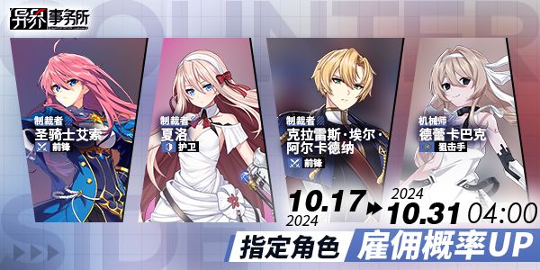 · 管理局已向各派遣势力公司发布了2024年10月更新计划清单,供老板们对下个月的更新维护内容进行预览。· 本预览清单内容可供参考,每周的更新内容情报仍将照常推送,不排除当周更新中调整更新内容的情况,所以每周游戏内容请以更新维护后的内容为准。 >>2024/10/3更新日【更新时间】2024/10/3 9:00am(无需停机) 【新增角色】SSR克雷德雷【新增角色雇佣概率UP卡池】S