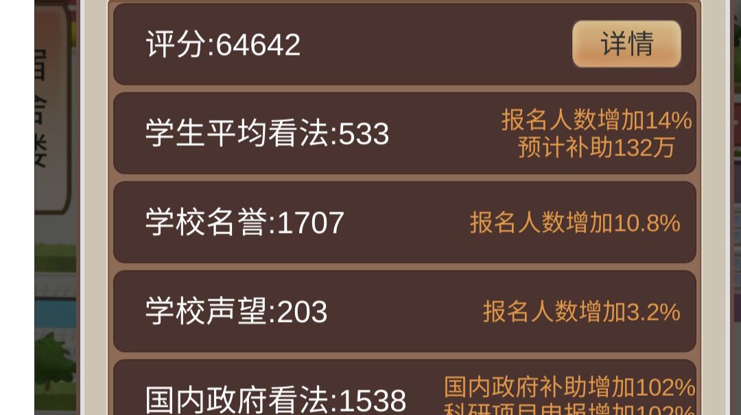写一下自己玩这款游戏的见解 开头怎么玩就不讲了,攻略有很多。主要讲一下中间, 学校招生 像我这个模板招生的话,再用200w宣传招生的质量比较好 从录取分数就可以看出来,说一下这个录取分数:如果你的招生人数同上一年一样的话,录取分数是会上涨的学费也不能变,其中一个变的没试过,我试过学费和人数同时20~30左右,200w不变结果录取分变低,总体质量低了,不划算。 食堂 全部升到最满级,招商食堂把800