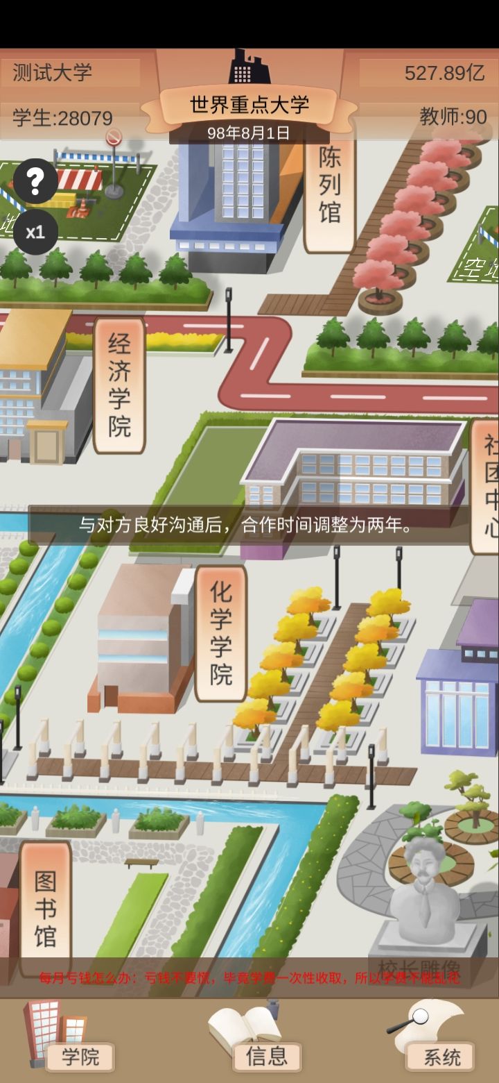 完整攻略 先说下收入,这个游戏前期的收入有政府补贴,建议不看广告没用,食堂收入,学费从前到后最主要的收入,专利,这个游戏到后期专利都没让我挣钱,cde无脑全卷了吧,主要思路就是打开收入,不建维护建筑,所以第一年建宿舍,商业街,第二年可以跳过,对没听错跳过,第三年学费收上来,加上第三年学费可以建学校,现在又没什么维护费用所以,第四年建学校,步子不要迈的太大小心维护费用,因为老师也要工资的么,不着急先