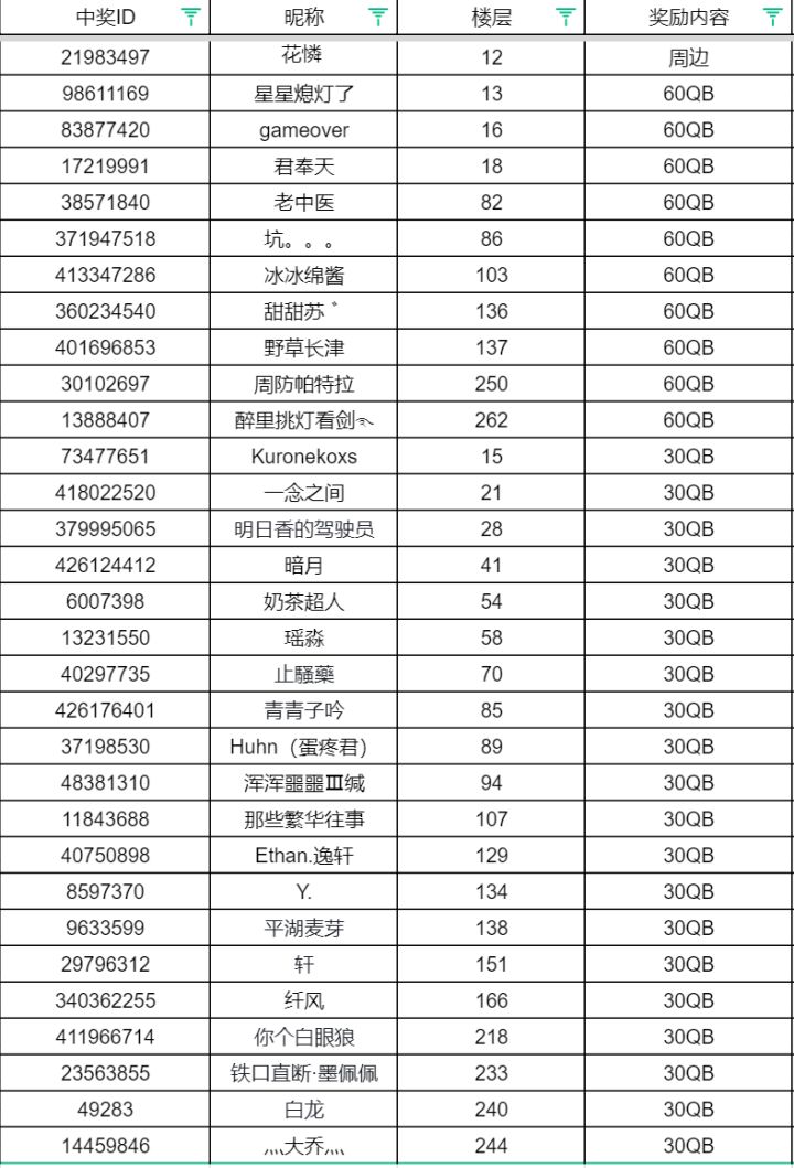 各位冒险家久等啦!沙妹已经完成了本次活动的开奖哦,和沙妹一起看看是哪些幸运冒险家中奖了呢!恭喜以上冒险家~请中奖的冒险家于七个工作日内添加企鹅3557769208联系沙妹哦~没有中奖的小伙伴也不用叹气,每月66节沙妹都会在这里等着你,等待我的好消息吧!———————————————————————————————————嗨~冒险家,是我啦,你的好伙伴沙妹!相信细心的冒险家已经想到了,哼哼~