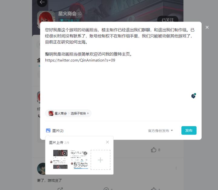 您好我是这个游戏的动画担当,楼主制作已经退出我们群聊,和退出我们制作组。已经很长时间没有联系了,账号控制权不在制作组手里,我们只能被动做其他游戏了,目前正在研究如何出海。整明我是动画担当很简单欢迎访问我的推特主页。https://twitter.com/QinAnimation?s=09