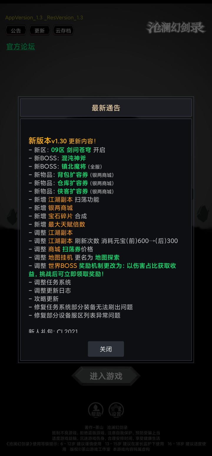 《沧澜幻剑录》更新啦!!v 1.30更新内容- 新区:09区 剑问苍穹 开启- 新BOSS:混沌神斧 - 新BOSS:镇北魔将 (全服)- 新物品:背包扩容券 (银两商城)- 新物品:仓库扩容券 (银两商城)- 新物品:侠客扩容券 (银两商城)- 新增 江湖副本 扫荡功能- 新增 银两商城- 新增 宝石碎片 合成- 新增 最大天赋倍数- 调整 江湖副本- 调整 江湖副本 刷新次数 消耗元宝(前)600→(后)300- 调整 商城 扫荡券价格- 调整 地图挂机 更名为 地图探索- 调整 世界BOSS 奖励机制更改为:以伤害占比获取收益,挑战后可立即领取奖励!- 调整任务系统- 调整更新日志- 攻略更新- 修复任务系统部分装备无法刷出问题- 修复部分设备服区列表异常问题
