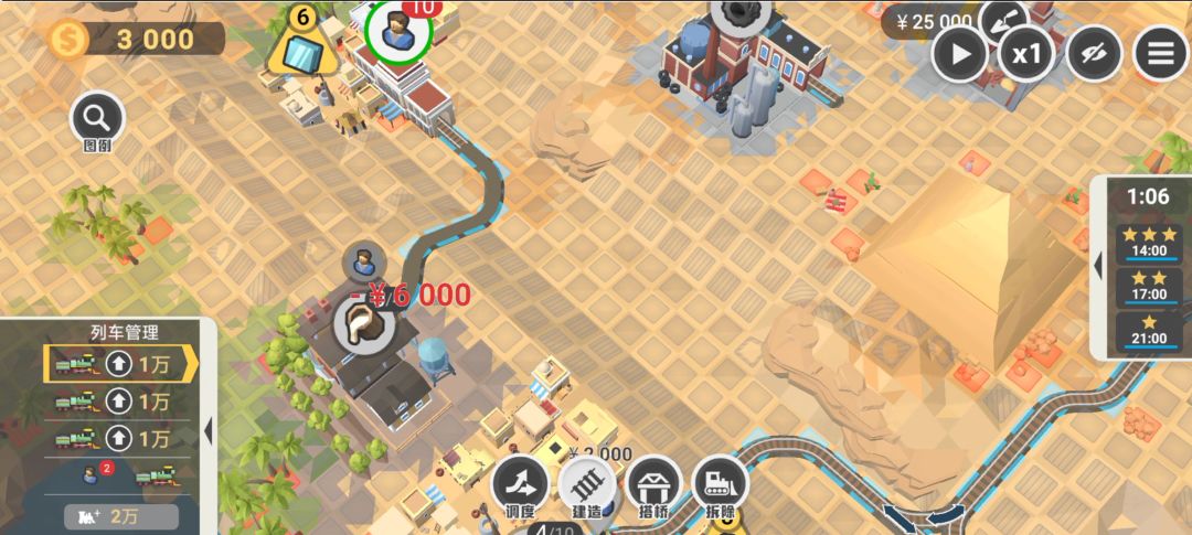 第八关-金字塔 满分条件:14:00内,不要让列车到错站,不摧毁轨道铺片。 物资需求:上方城镇6个砖头,6个玻璃;下方城镇8个轮胎。 流程:1,先铺设下方城镇与砂石厂的铁路,派遣工人,赚一点小钱后,继续铺设下方前往砖头厂的铁路,派遣工人,再铺设砂石厂前往砖头厂的分支铁路,这边目标就是存够6个砖头和6个砂石。 2,下方循环跑起来后,有个6000,就可以把上方城镇与橡胶厂之间铁路铺设起来了,派遣工人。