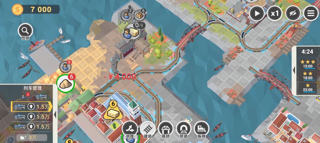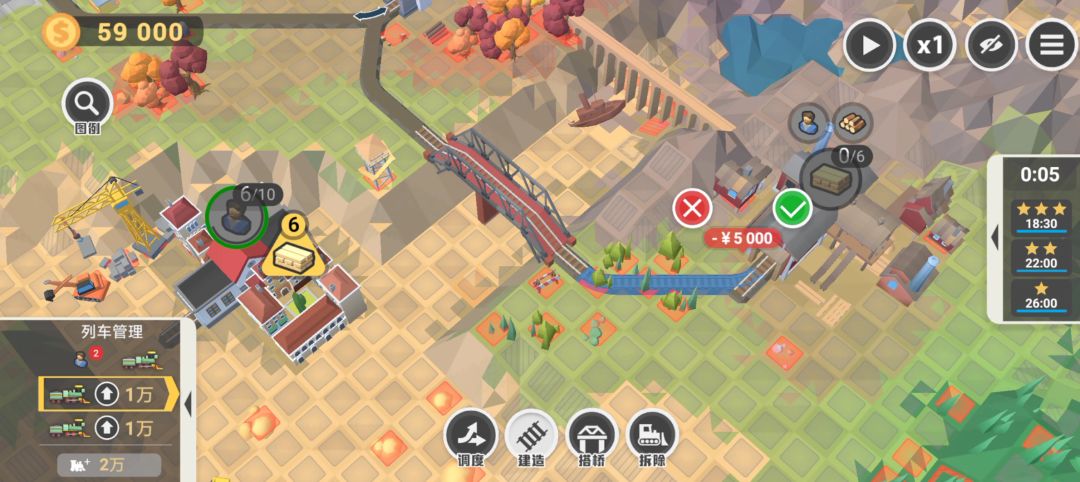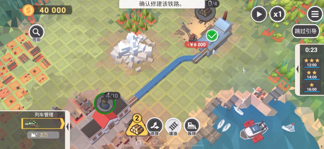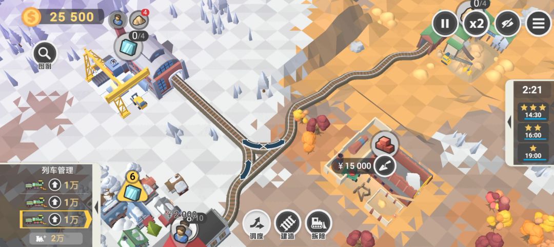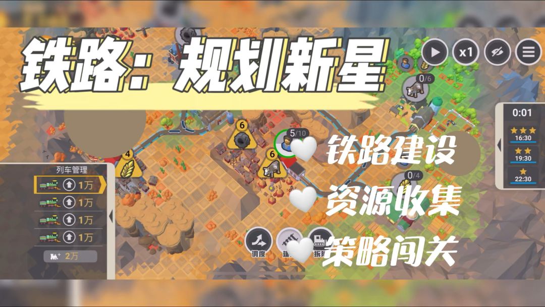 一款很需要策略与并行思维的益智类游戏,下面来看下它的前3关流程攻略~ 序 流程:手指拖动画面到最大——点击三角形木材图标——点击建造,选择铁路的两个端头然后确定修建——点击工人图标——等待工人过去,木材数量足够2以后,点击木材图标运回来——点击右上角x1变2倍速——点击隐藏交互界面,再点击回来,完成第1关。 说明:没任何难度,第1关就是给玩家熟悉下基础操作的,根据引导完成即可,第一次玩别跳过引导,