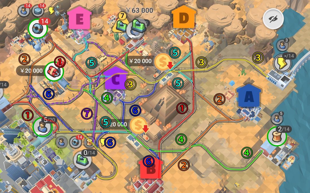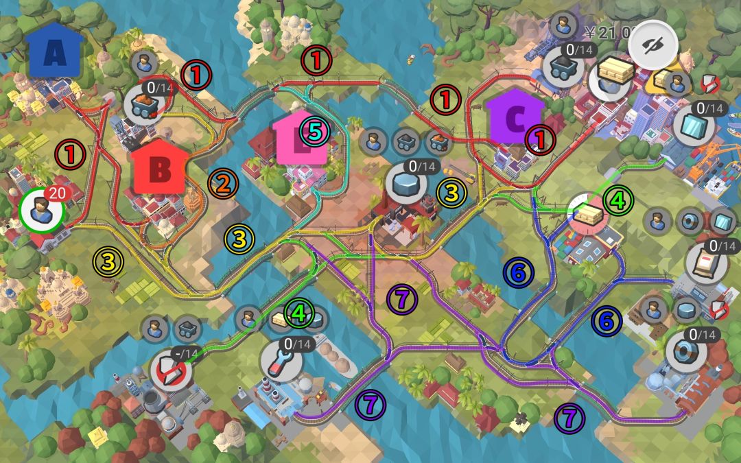 注意,第一次地形变化后才建④线,第二次地形变化后才建⑤线,运输炸药炸通道后才建⑦线,地形变化似乎是根据时间和完成配送来的。