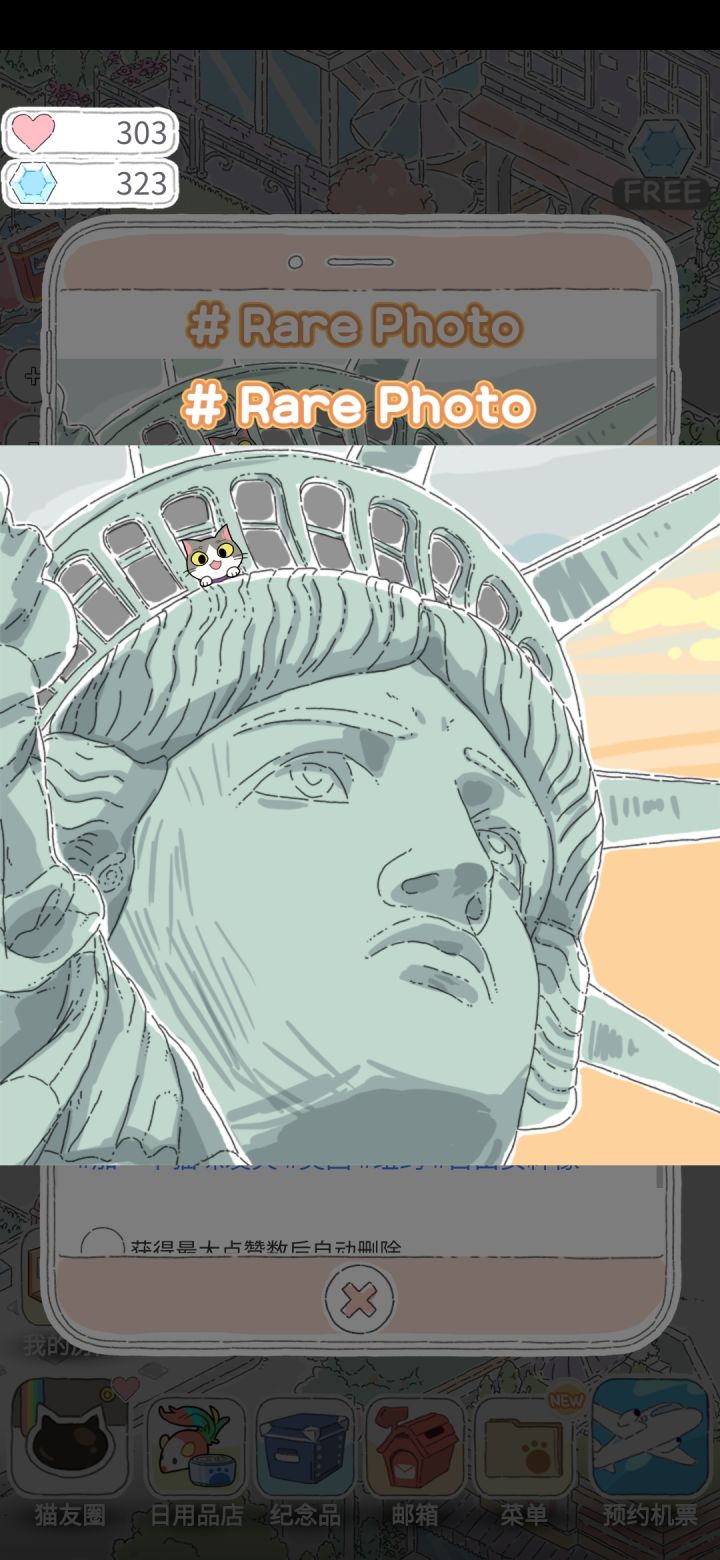 玩了几天大概摸清玩法了,先稍微总结一下,有不足的地方等快全收集的时候再补充。一、基础玩法讲解:咦?我打开这个游戏到底要干啥?首先,游戏的基础玩法就是消耗点赞数买票送猫出门旅游,猫拍了照片发猫友圈吸引点赞这样的反复收集充实图鉴的过程。可玩性……几乎没有,就是一个画风清新的休闲小游戏,空闲时打开手机点点就行了。时间不同的旅程,猫会去的地点不一样,照片能够获得的点赞数量上限也不一样,如果你的猫