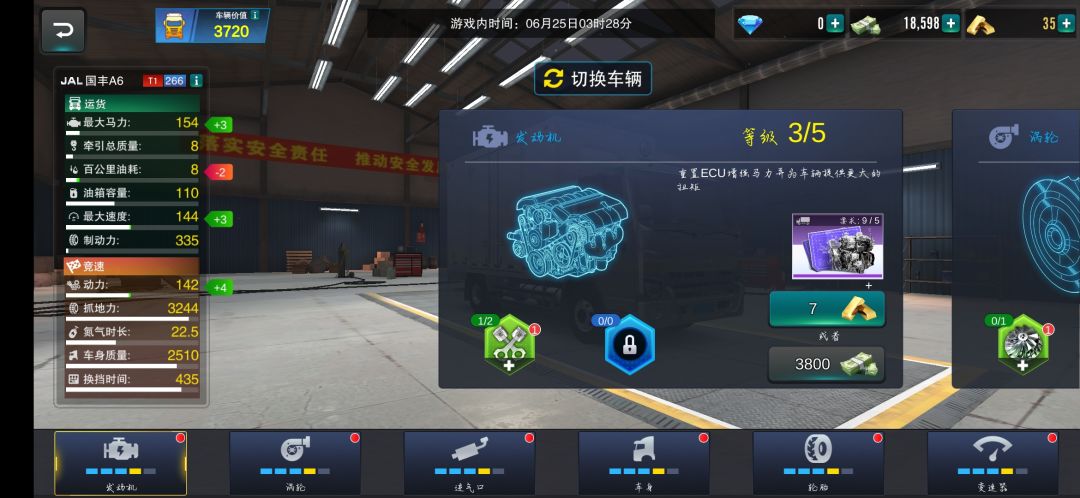 1.开局金条不要乱用,攒着买 国发J6 闪龙f20 淮发k5三辆特选车,钞票不多的情况下也要尽量升级这三辆车的车身,车身会增加拉货的重量,使货不受限制 2.每天跑3把特选订单,系统订单刷新顺序大概是J6、F20、淮发K5,主要赚钱的是淮发K5,跑20分钟左右能赚12万。每天花不到半小时跑特选正常能赚12万+,运气好碰到两个大单1小时能赚24万+ 3.跑特选订单攒钞票的同时把金条攒好不要乱花,攒足3