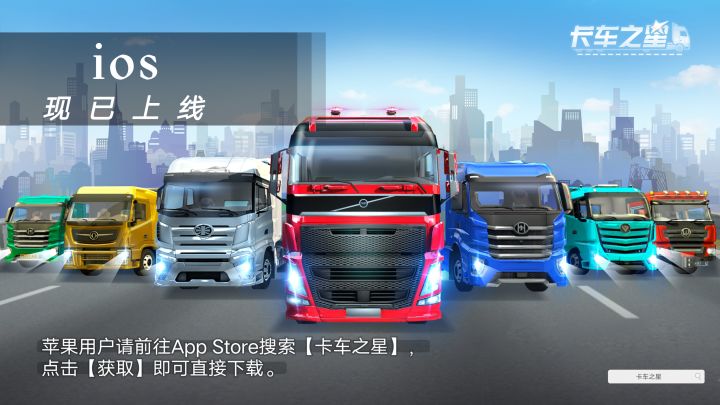【卡车之星】正式上线App Store,同步线上安卓版本的内容。苹果用户可直接前往App Store搜索【卡车之星】,找到相应的游戏,点击【获取】即可直接下载。(ios版本与安卓版本数据不互通!)