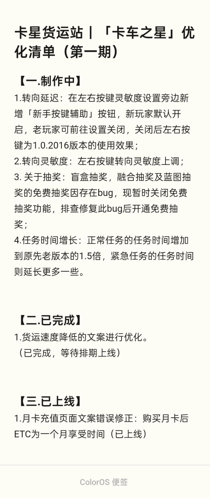 现在游戏可玩性比较低,地图来来去去就那几个,跑图跑几次就腻了,开长途太无聊了,车灯雨刮器有些问题。我提几个建议:1、开放地图,目前就两个城市,大多数人跑了几次就不想跑了,就等星级任务拿金条2、增加联机模式,跟朋友一起跑图增加娱乐性,不然一个人跑图太无聊3、增加司机可下车的功能,在装卸货物以及服务区等特殊地点司机能够下车转一圈,在装卸货物可以添加一些场景对话。在服务区添加司机下车进商店购买货物或者加油后到商店付款等场景。商店的商品包含食物饮料等物品,不然就只能在主页或者装货那会用金条买,局限性太大4、添加司机喝饮料的动作,加油时与工作人员的对话,加油的油量选择,装卸货物可下车与工作人员的对话5、改善一下车灯,雨刮器,地图以及导航等一些小问题。比如车灯打开了跑长途还是觉得照明距离太短而车前方光度太亮。自动雨刮器在停雨后再关闭。导航提示的太慢,基本要等到快转弯了才提示,跑长途的时候没看导航一下子就会错过匝道。在高速某些匝道两条道实在是太窄了,只能压线走,希望能够把道路扩散一下6、增加音乐功能,在游戏内添加音乐平台登录,这样就不用再后台挂音乐了,跑长途就没那么无聊了,最好是能在车内做一个开关音乐的动作7、增加按键自定义功能,让玩家能够根据自己的习惯调整按键的位置8、增加司机开车灯,开雨刮器,拉手刹的动作,现有的按喇叭的动作做的很好,在副驾驶位也能看到司机的动作