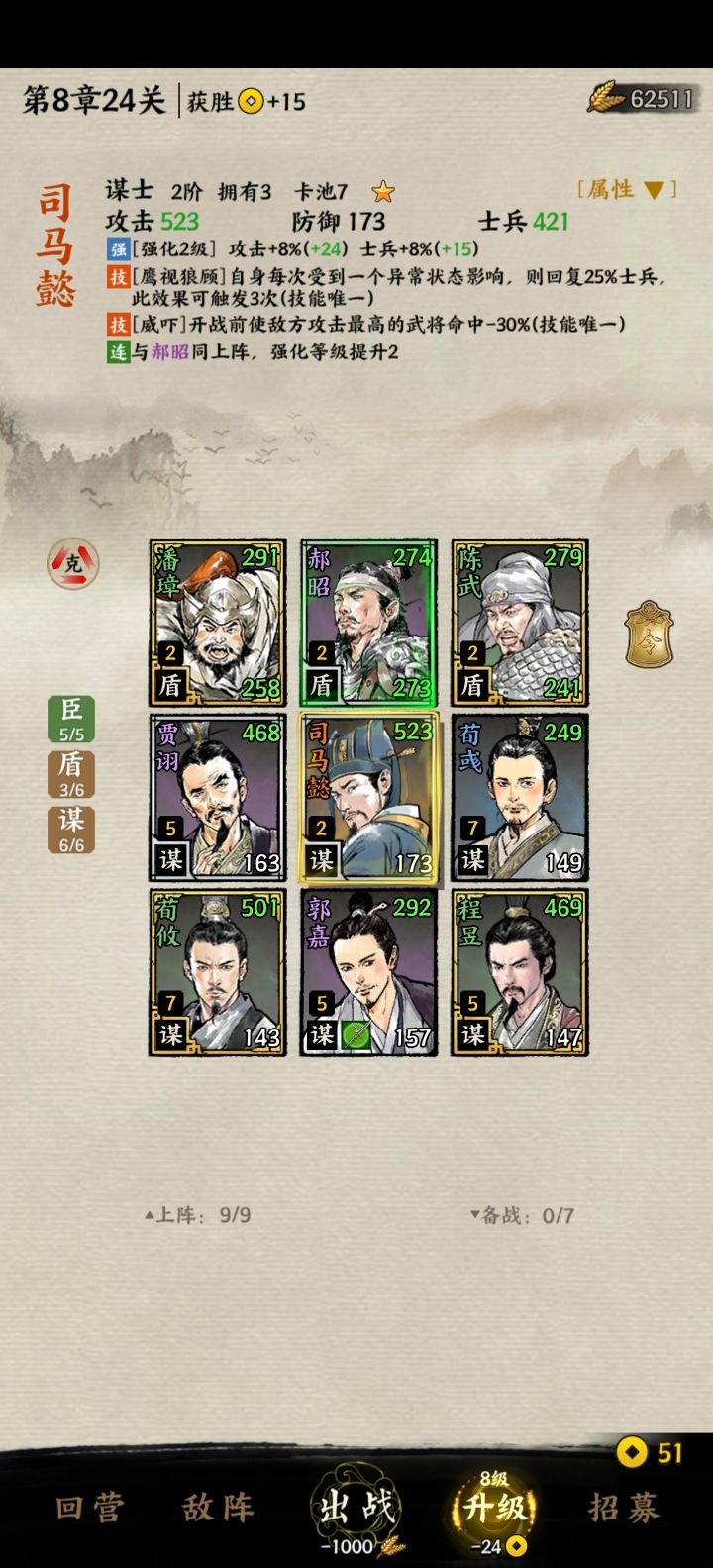 3马3突!以父之名yyds!!马腾1级放前排快速去世,马岱马超秒变杀神,马岱必须追三!!3盾5谋!5谋士强度非常高!荀攸陈昱可以追三!有司马懿可以凑齐6谋连携郝昭,没司马懿可以带鲁肃3盾陈武潘璋可追三不然扛不住,也可以带黄盖郭淮。希望对才入坑的有用!!
