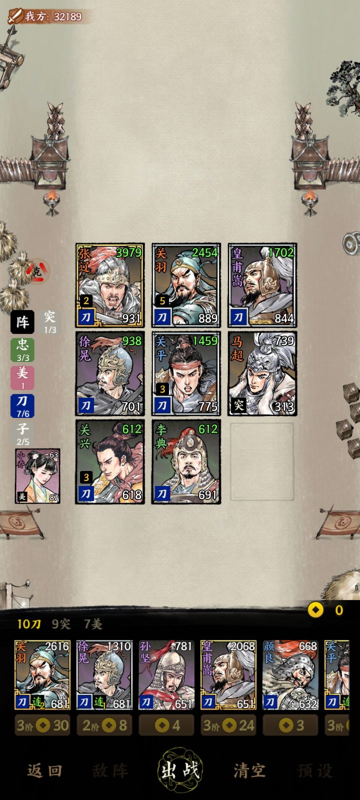 本篇写于7月测试,虽然版本更新,但我也在更新,站位,以及过关思路可放心食用确实也没啥好讲的,又是一个赌狗场🌚🌚这游戏哪里都在赌冲刺场(六刀➕马超)三星张辽顶前面,关羽输出,徐晃挨打工具人,马超加攻工具人,关平,关兴吉祥物,小乔妙手回春摆位:张辽一号,关羽二号,徐晃三号🌚🌚这样在最后精英怪的时候,三星张辽能活下来,搭配小乔奶,究极无赖(注意给马超留残血加攻之类巴拉巴拉的)远射营(五臣六谋)