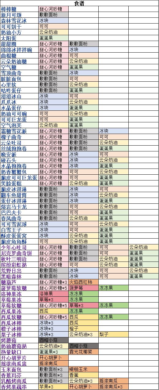 烹饪食材获取方式(普通食材、水果、蔬菜) 种植森林之心;维娜奇商店直购;种植种子收获作物 种子获取方式 维娜奇商店直购;河流漂流物 普通食材获取方式 甜心河砂糖——森林之心种植于甜心河畔的水上 敷敷面粉——森林之心种植于面包森林的水上 冰块——森林之心种植于冰淇淋山洞的山洞天池 可可——森林之心种植于音乐广场的水上 云朵奶油——森林之心种植于蛋糕山的奶油湖 蛋蛋果——森林之心种植于巨蛋谷、鸡窝偷蛋