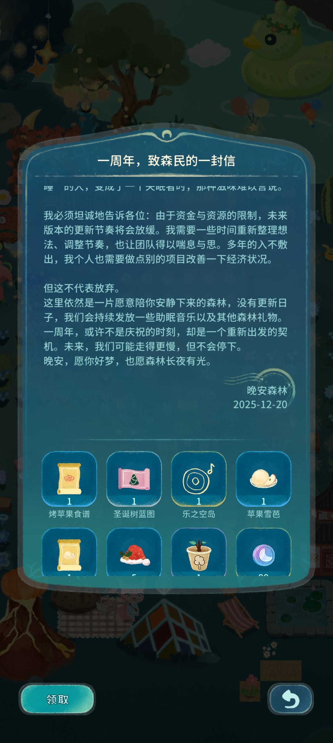 一周年,致森民的一封信亲爱的森民们:我是小洛。今天是2025年12月20日,《晚安森林》公测一周年。在这个本应充满庆祝的日子,我提起笔,心中百感交集。首先,一定要说的是——谢谢你们。感谢每一位走进这片森林的玩家,感谢你们愿意在此停留、感受、陪伴。尤其要感谢从测试期一路走来的老朋友们,是你们的每一次反馈、每一句鼓励,支撑着我们走到了今天。多年前,我们怀着一个简单的愿望出发:在这个快节奏