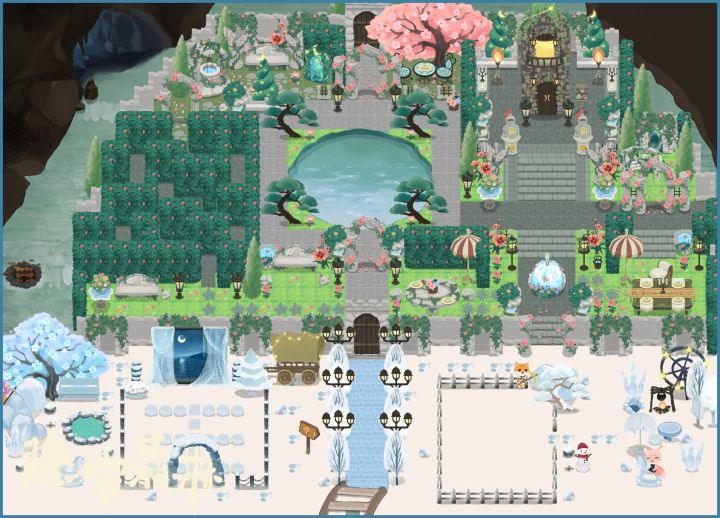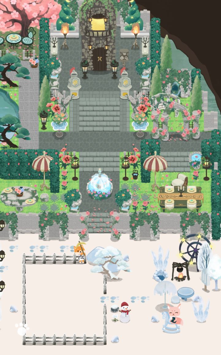 冰淇淋山洞场景完工啦。这个场景大致分了六大块,以中间的湖为中心,讲究对称 。进山洞是一片雪地,外面的雪飘进来啦,左边是流动剧团开演的场景,右边是每个地图必不可少的田地啦。过了城堡围墙左边是花墙迷宫,主打一个乱、迷,右边是野餐的花园,特地摆了两张大桌子。再进一步,左边是比较安静的小花园,还有许愿池和神秘传送阵,出城的城门右边还有休憩的地方,再右是威严的城堡,城堡右侧还有一个神秘小庭院,里面的