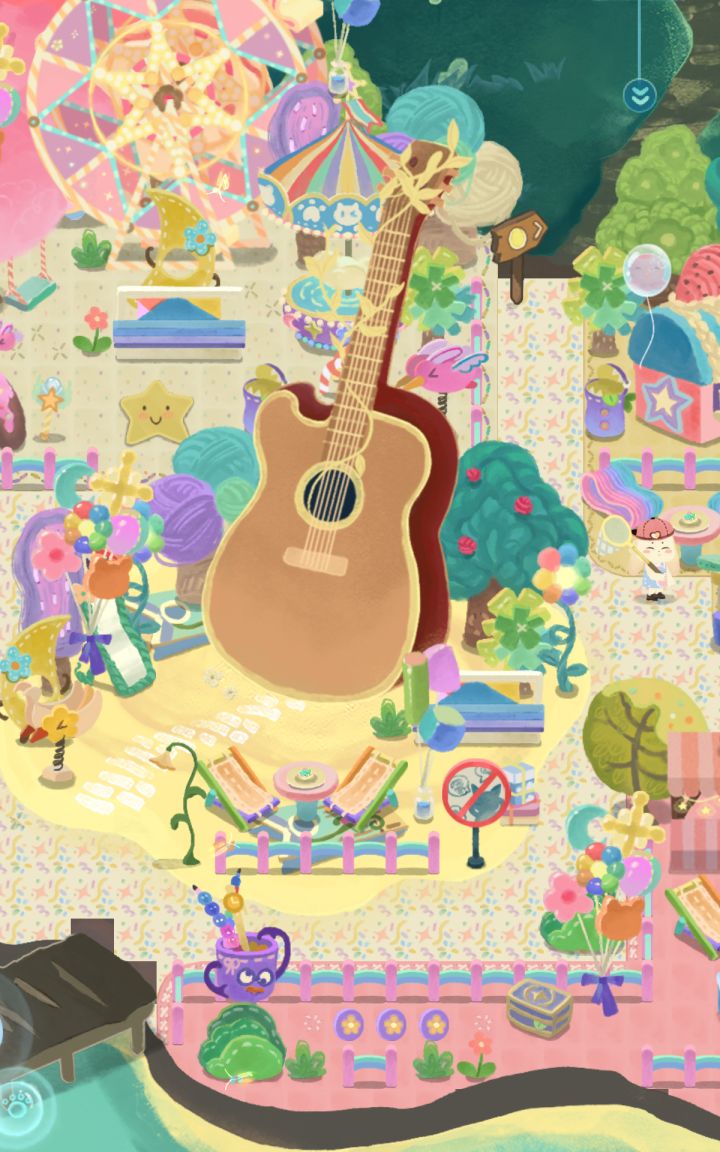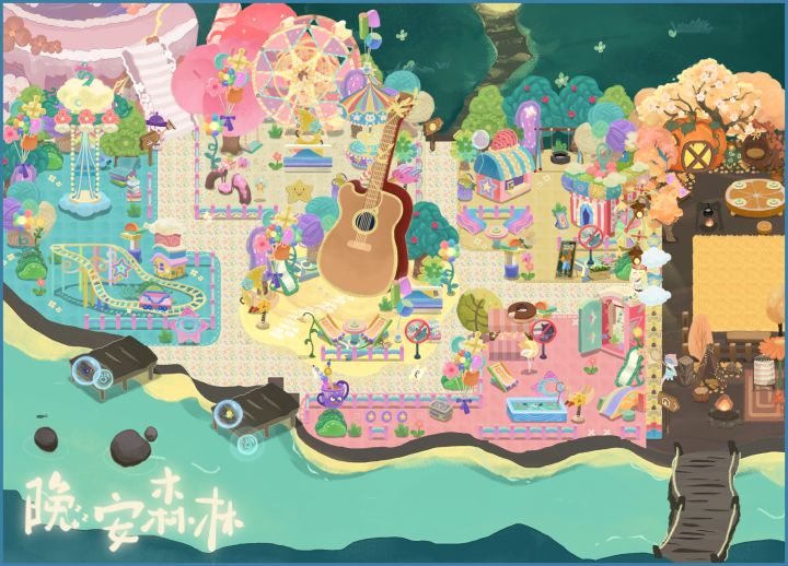 弄了好久,终于把这张图装修好了,参考了官图。原本音乐广场是打算装修成P3右边那种秋天牧场的风格,但是游乐园这个主题想想还是放这了,就只留了一小块地方弄成秋天的景色,只希望下个池子不要是秋天主题的吧,不然真不知道放哪。唯一的遗憾就是没有竖着的大门,只好挂了几个气球当门了。已经装修完两个场景了,普池也抽得差不多了,接下来打算装修冰淇淋山洞。#晚安森林