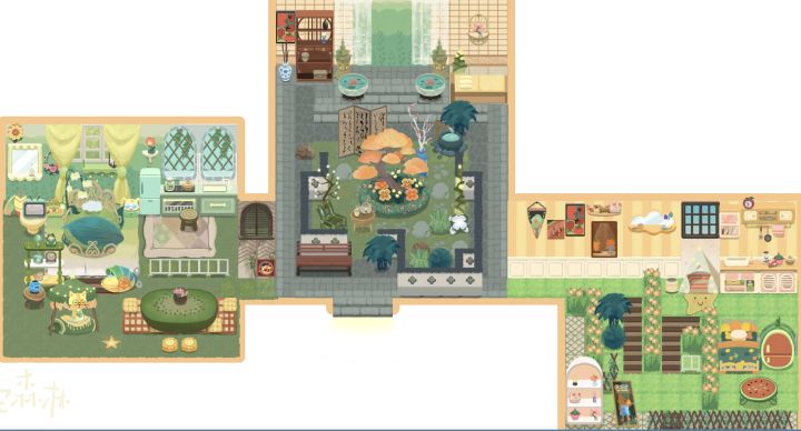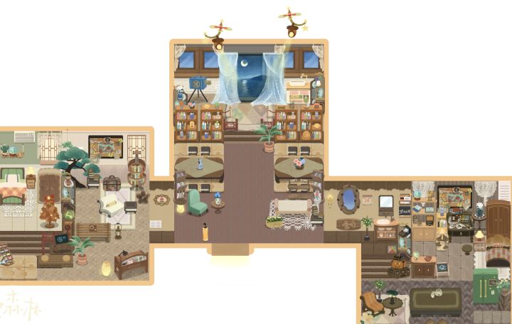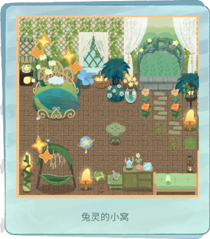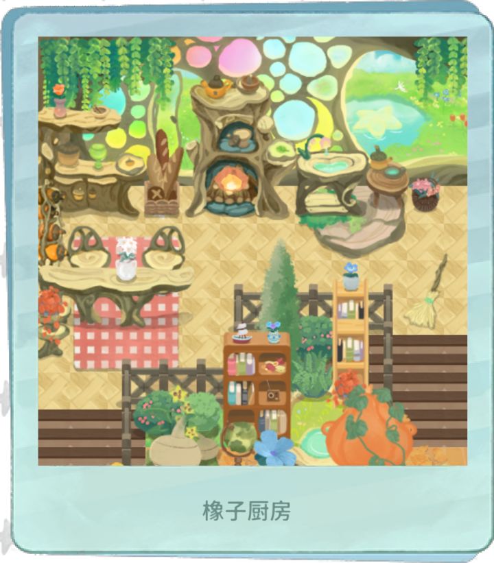 房间展示—森林中的橡子树屋🌷|月亮河花园草原上月亮河静静的流淌。花儿在河水的滋润下竞相开放,支起画板将春意揉进画笔。🎪|篝火营地森林里支起了小小的帐篷。在帐篷里,森林的风声格外活跃,像为在篝火庞起舞的小咕噜奏乐。🍞|橡子厨房穿过紫藤花墙进入树屋。在温暖的橡子壁炉旁享受着暖暖的下午茶。🎃|蔬果餐厅巨大的南瓜在小小的树屋里快装不下了。咕噜们也好奇巨大南瓜是比普通南瓜更加美味?🌿|爬藤