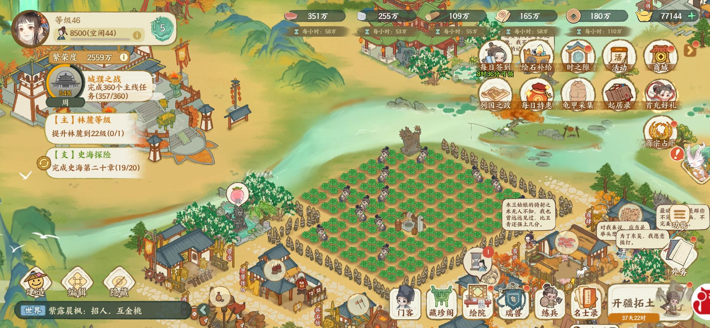 希望后面能多出一点新建筑和名士。这次中秋出的建筑很好看,它是一整个不能编辑的大套,而且氪度不够就完全没有,高低送一点同主题小建筑也好,要不然零微氪可玩性大大下降。