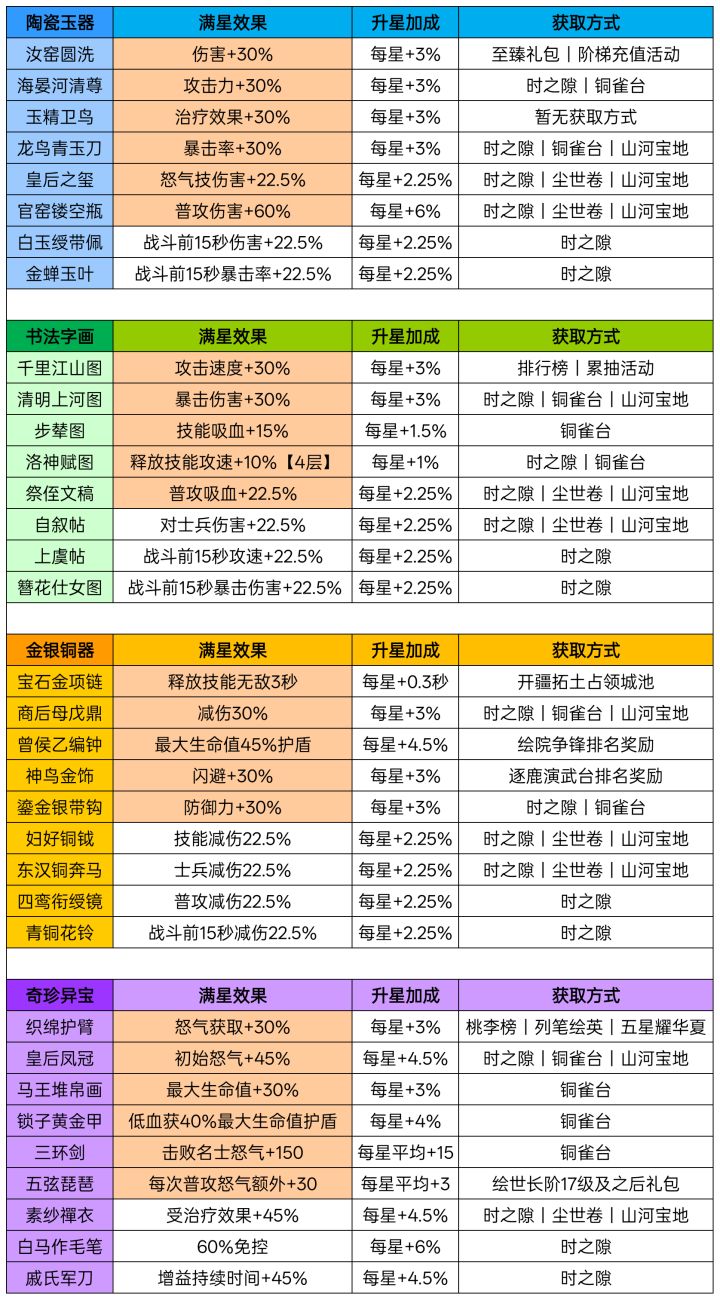 华夏绘世录中文物分四品,但只有天地品文物有特殊效果,所以玄黄文物仅可用于前期过渡。获取天地品文物有三种途径,分别是时之隙抽取,逃离铜雀台(14天1次),山河宝地(21天1次)。其中,时之隙为随机获取,山河宝地碎片很少,因此平民获得心仪天地品文物的主要途径为逃离铜雀台。【第一章:文物获取】先来一张天地品文物效果及获取方法,上图橙底效果所属文物为一队推荐文物。不难看出,部分文物获取方式单一,