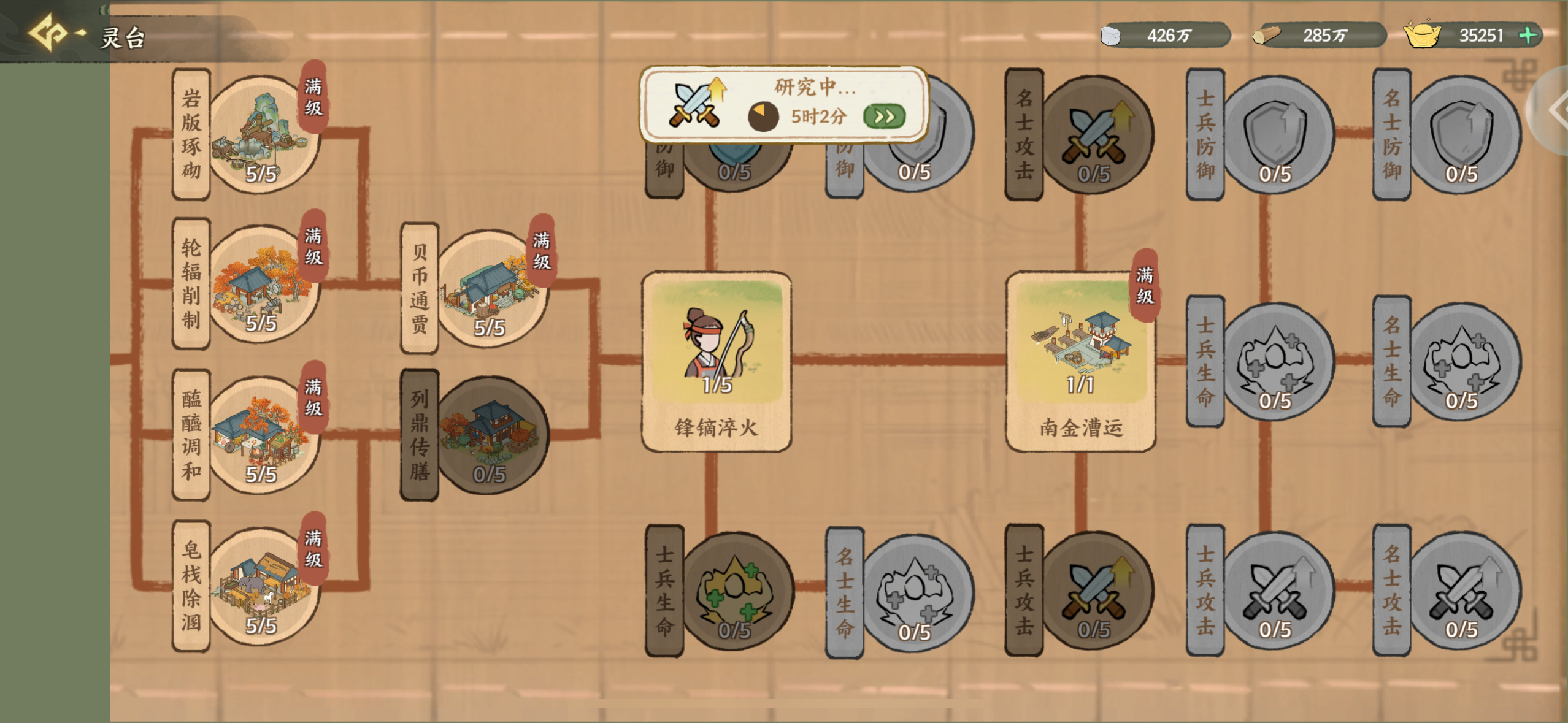 灵台周朝最后六个科技需要40亿资源60天时长,与前期的资源消耗相比一个天上一个地下。在资源建筑方面升一级需要100w(加人口多1000每小时,加速率的多500每小时),需要1000-2000小时回本(40-80天)这还只是一个周朝。这会极大消耗玩家的游戏热情。这还只是周朝,如果开了下一个朝代,那到时候的资源消耗更是不敢想象。当然这又很现实的问题——(游戏开发需要时间,不能让玩家一下子玩到毕业)。与