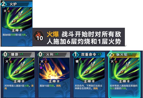 说在前面,《纵横》的角色池,紫卡中有且仅有一个角色是属于火系的,而金卡获取比较困难,这里暂且不提,所以灼烧就显得有些尴尬,但实际上灼烧不仅仅是无视护盾的高爆发,更是可持续的高爆发。(图为紫卡—僵尸道长)灼烧最核心的就是“火势”,保留当前灼烧层数,因此燎原和火炉两张牌都是TO级别,见到就可以抓。而双重命令也可以有效的将火势叠起来,属于T1级别(如果钱不够升级,可以不拿)。火刑作为低费高灼伤牌,