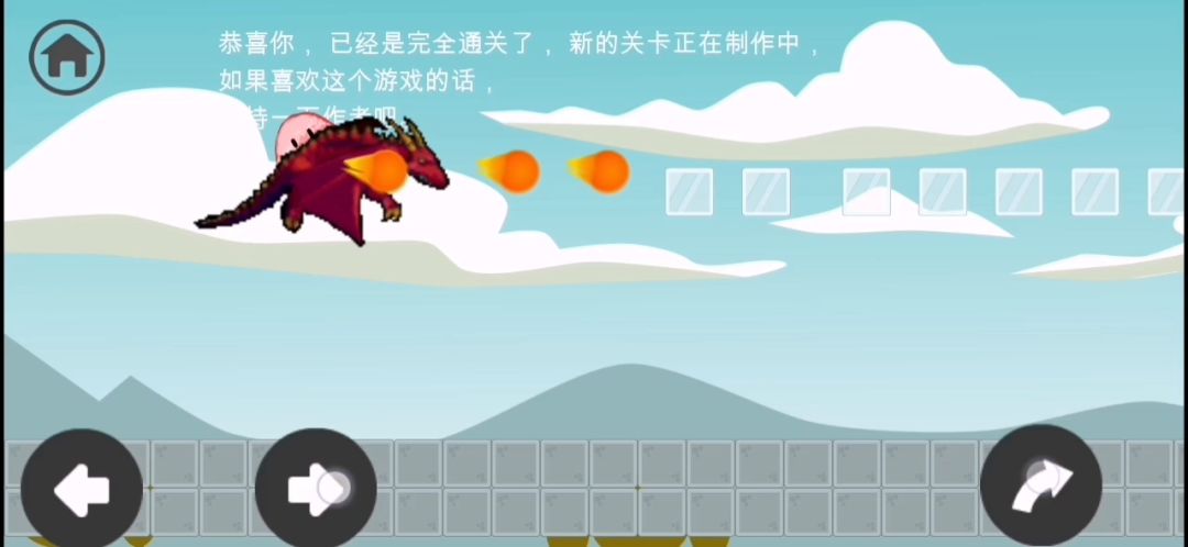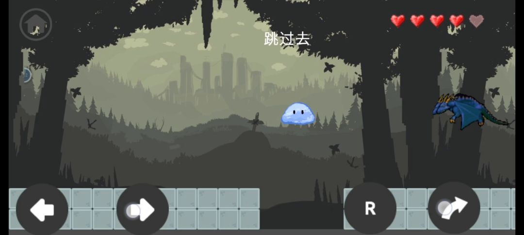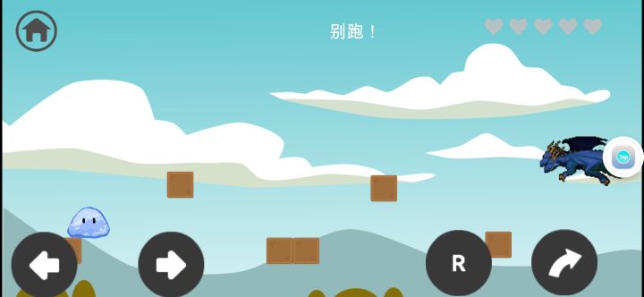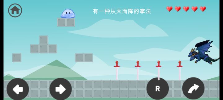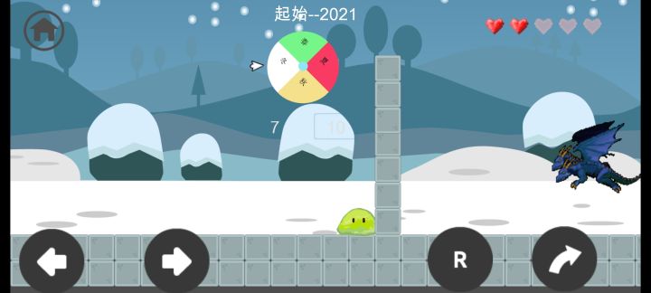 游戏目标:你是一只史莱姆,想办法把自己送到一只蓝色的双头龙面前第1关:往前(右)走,跳一下,碰到龙即可过关第2关:往后(左)走,碰到蓝色龙即可过关第3关:按R键(多按几次)把史莱姆变成红色,碰到龙 即可过关第4关: 跳到如图所示位置,再往前跳一下(有卡住的可 能,多跳几次)会跳出屏幕,继续往前走,碰到 龙即可过关第5关:按R键把史莱姆变成绿色,就会刀枪不入,等待 一段时间(经计