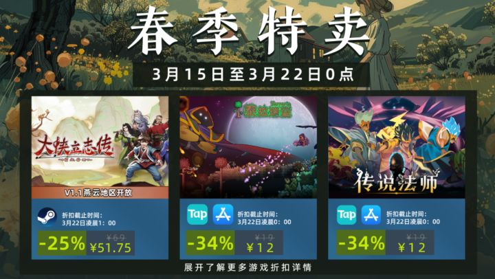 Hey,各位XD独立游戏的玩家们,2024春促折扣将在下周五——3月15日正式开始,本周的独立游戏资讯专栏则跟大家预告分享一下本次的折扣详细信息:春促时间:3月15日-3月22日本次的春促折扣会在3月15日开始,并持续到3月22日,在不同平台、折扣结束的具体时段会略有不同([○・`Д´・ ○] 容易等到最后一天再后悔错过折扣的兄弟们小心了!)此次《大侠立志传》和《湮灭线》都将以最新的史低价