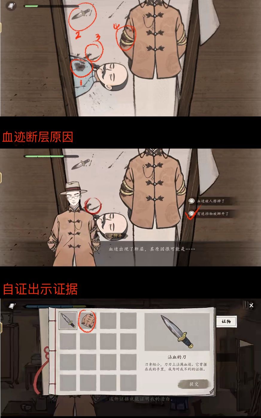 #山河旅探攻略征集 #山河旅探打卡 #游戏攻略 📚第一章-无妄之罪 “我曾与死亡签契,静候他的到来。今夜,他终于叩响了门扉。” 一、自证 1、首轮搜证——尸体 ①胸口血迹 ②周围血迹线 疑问——有遮挡物被挪开了 ③匕首 ④“我”的袖子上的血迹 ㅤ 2、推理 出示物证——血衣 ㅤ 二、正式搜证(💡所有对话项都可以进行) 1、屋内搜证 人证: ①马捕头②张知县③罗世文 ㅤ 物证: ①床 ②床边木箱 ③