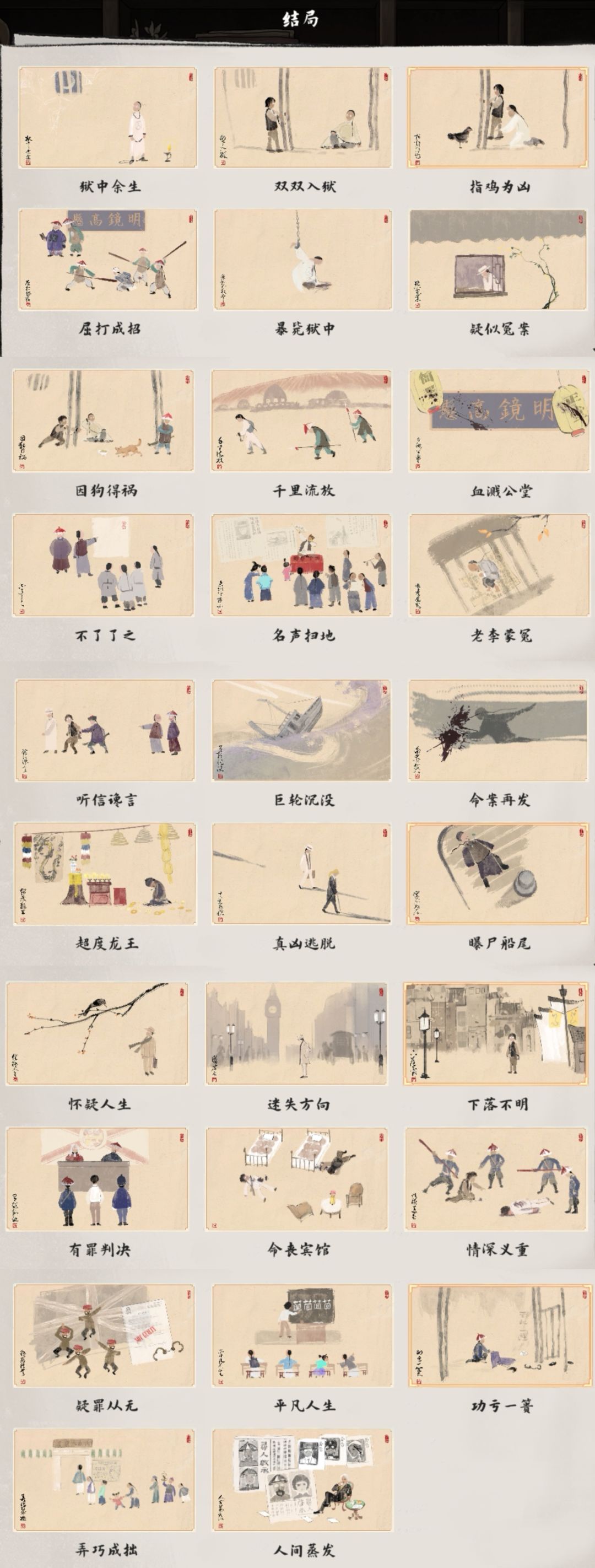 流程成就第一章【仵作入门】【证据在此】【无妄之祸】 第二章【柜中书女】【普通西装】 第三章【闪亮登场】【炉边祟影】 第四章【大发明家】【郝诗一首】【迷雾诡船】 第五章【斗室疑阵】 第六章【落魄侦探】【身手了得】【抽丝剥茧】【申城迷局】【公园喵】 章节内成就【焕然一新】任意时间地点换一次衣服 第一章【神乎其技】第二幕带阿福开衣柜(顺序1243)一次成功 第二章【一丝不苟】第二幕观察炭盆后用炭涂抹书桌