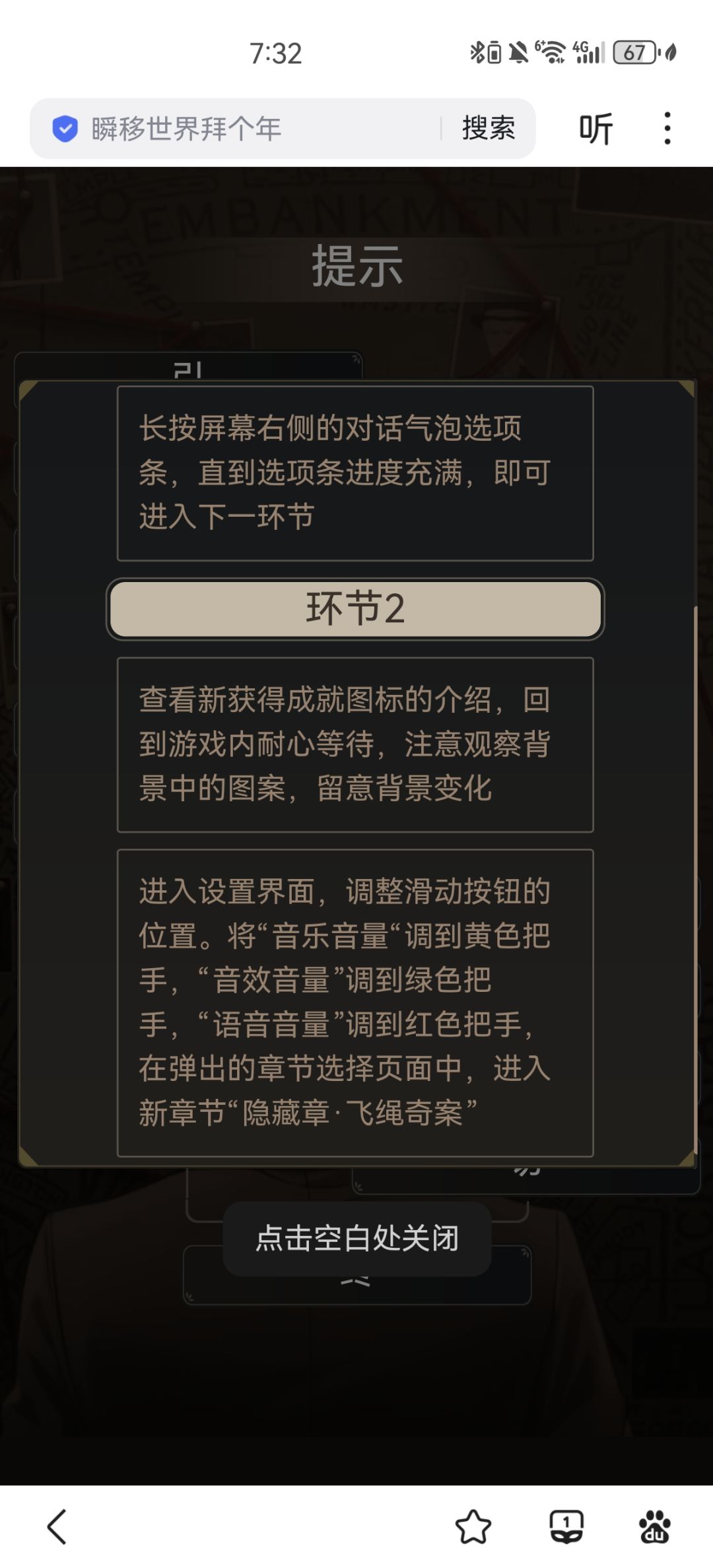 伦敦旧案+第五章《斗室疑阵》 1.被大头追逐,上下避开障碍物 2.回到哥哥房间,进入警局办公室 3.可以不用回忆案发现场 4.某件物品与手上文件不一致:警区地图 5.哥哥刺死自己的奇怪证据:凶器匕首 6.钥匙在哥哥手里可能因为:送回了钥匙 7.通过哪里送回来:通过门送回 8.凶手怎样通过门把钥匙送回:利用机关 9.凶手利用这件物品将钥匙和手连接:摩斯码纸盘 10. 摩斯码纸盘👉🏻蜡烛阵👉🏻矮凳👉🏻