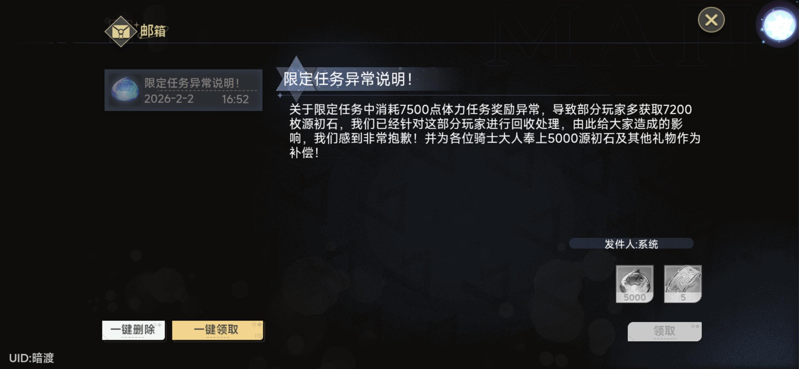 亲爱的骑士大人:本次版本限定任务中,【消耗 7500 点体力】任务出现奖励异常,导致部分玩家额外获取了 7200 枚源初石,目前我们已对该部分异常资源完成回收处理。对于此次问题给各位带来的不便与困扰,我们深表歉意!为弥补影响,现向全体骑士大人奉上补偿福利:5000 源初石 + 高级封鬼符 * 5,该补偿已经发放至大家的游戏内邮箱,请注意查收。后续我们会加强任务配置的核查校验,避免类似问题再次