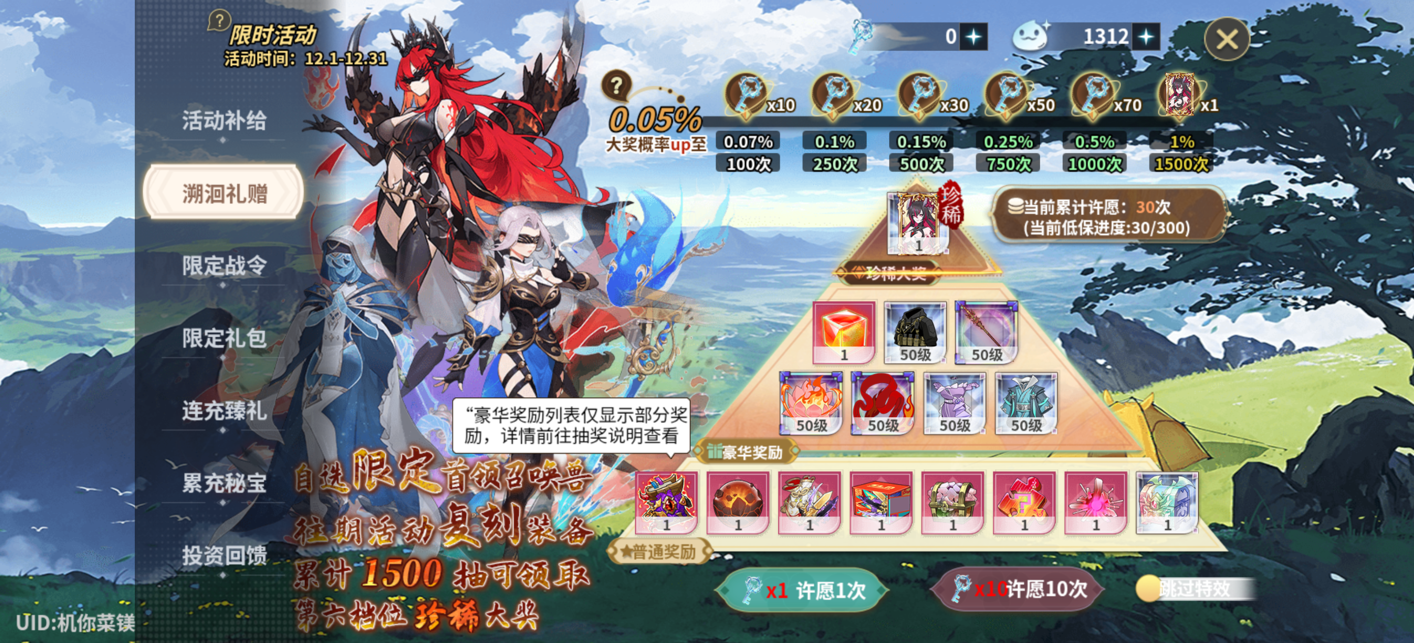别看了过时了,氪泪滴去---11月11日2025年8月21日早上,心情不错,随便加俩字,有错别字请留言,偶尔改,反正咱懒讲在攻略以前:游戏的主要玩法是爬塔(不爬你连活动都拿不满),很累,本游戏每个版本(持续一个月)有一个2000抽(一抽最便宜1.5r(商城30r的礼包有20把),最贵6.48,每天可能可以白嫖8抽,且可以用1000钻买10抽(不一定,有四种奖池,本期就没有每日8抽))保底获得的