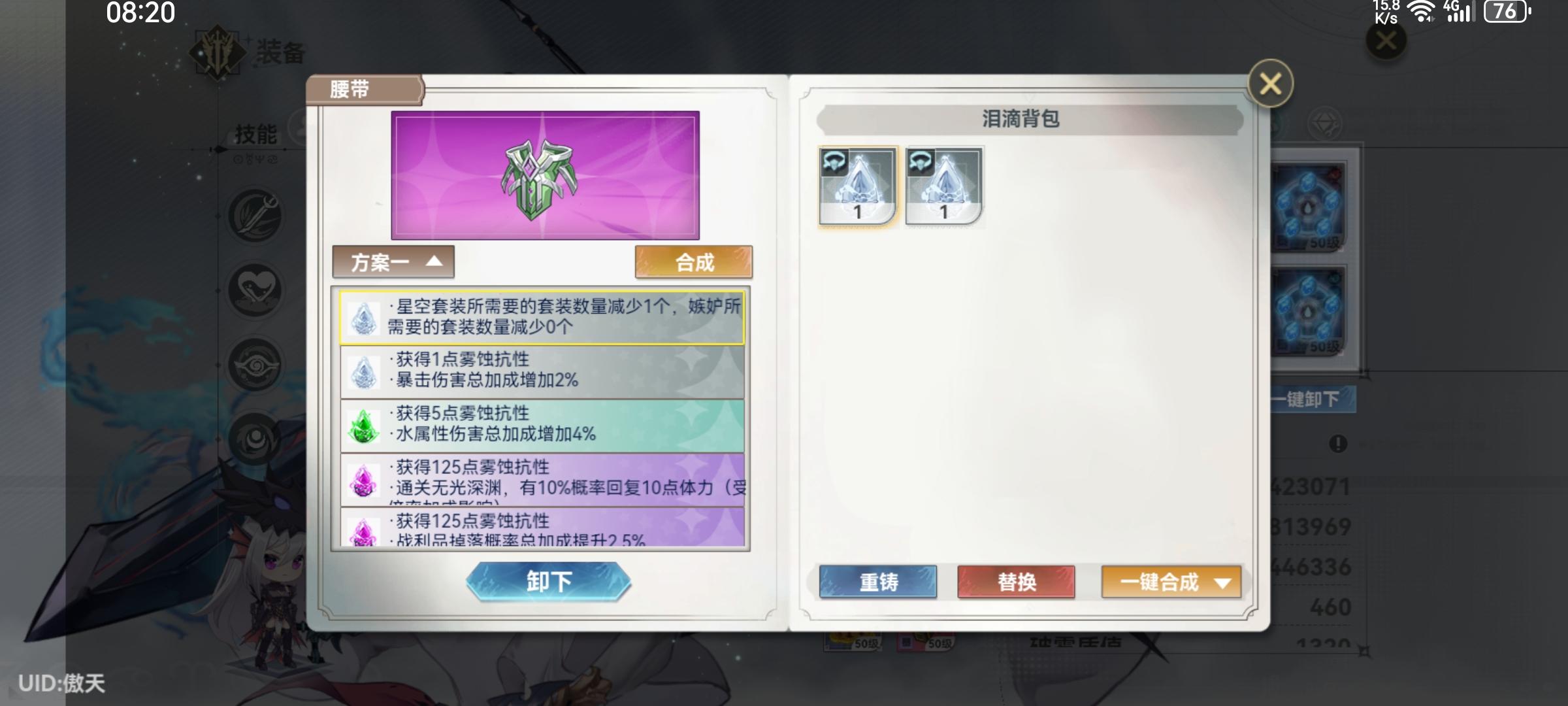 晚上不能玩史,合泪滴上头了,直接全合到至宝,2合1真刺激。出了个小小无尽怒火!需要一个诸神放大招,新无间装备手指-第一个冒险技能放无尽怒火,冰箱武器加冰箱魔瞳不带蛇衣直接触发冰箱,螺旋长枪普攻放无畏剑术,一秒就能无视限制直接放4个技能,满状态秒boss。