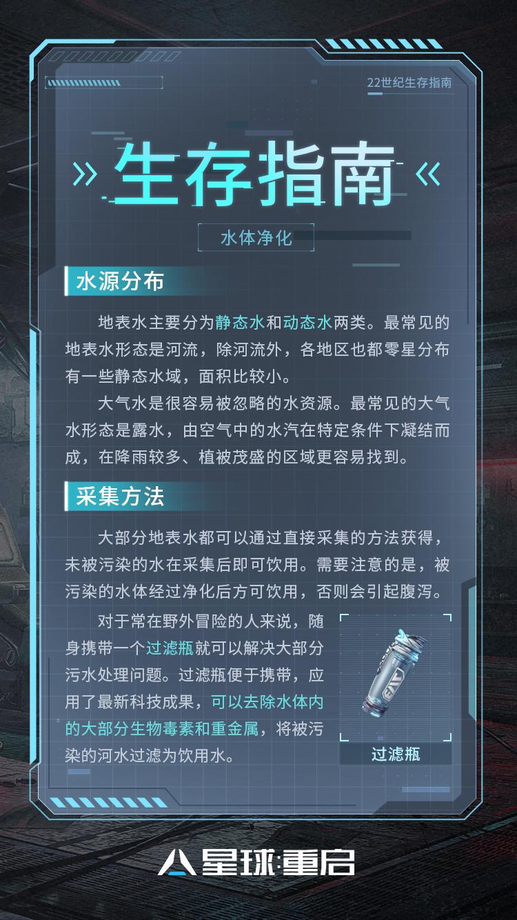嗨幸存者们,又见面啦! 最近天气越来越热了,阿姨过上了每天一杯冰镇快乐糖浆的生活[]~( ̄▽ ̄)~* 不知道各位幸存者的解暑饮品都是什么呢?天气炎热,如果经常在室外活动,一定要多喝水来补充体内流失的水分~ 不过,在《星球:重启》的世界里,喝水也是一项需要学习的技能。本期生存指南将会给大家详细介绍水资源的采集和过滤技巧,各位幸存者一定要认真阅读哦~ 重金属和生物毒素……原来被污染的水这么危险(●—●