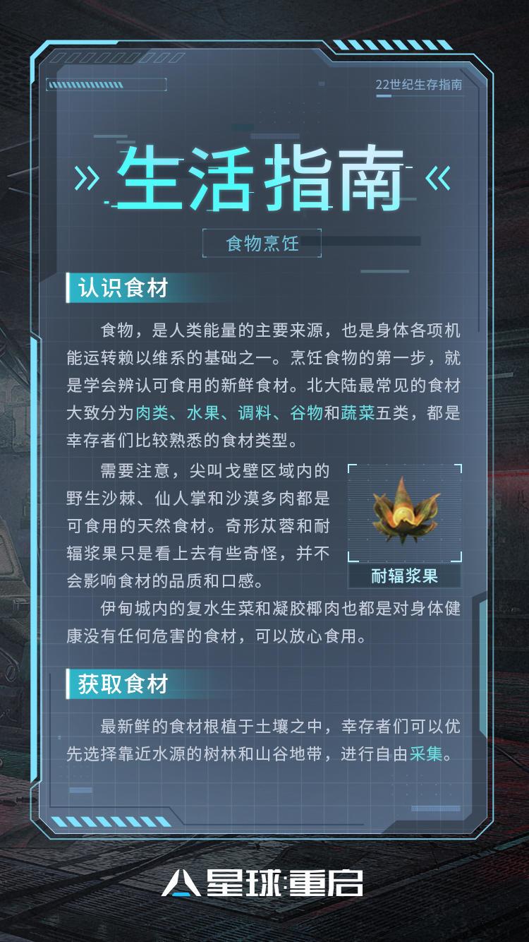 亲爱的幸存者们,大家好!阿姨又带着新的生存指南来和大家见面啦~ 想在《星球:重启》的世界中健康长久地生存下去,学会寻找食材并对其进行烹饪加工是必不可少的。本期生存指南将会给大家详细介绍如何辨认食材、如何获取食材及如何烹饪,各位幸存者一定要仔细阅读,努力做出饱腹又美味的食物哦! 嗯……不得不说耐辐浆果看起来真的很奇怪。不知道这些奇怪的食材可以组合出什么神奇的料理呢?总觉得这届幸存者里面会有很多黑暗料
