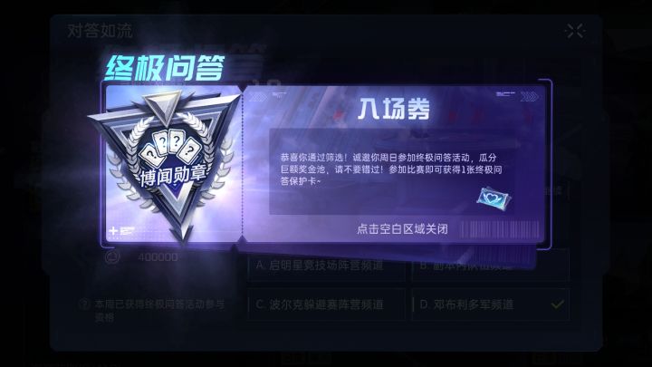 幸存者们早上中午晚上好!又是我,身兼多职的扫地阿姨!今天的我是生存小百科ヾ(*>∀<*)ノ 质疑答题,理解答题,爱上答题。在咱游的日常答题中,无论对错都能获得曙光徽章与金条,简直不要太快乐! 公测开启后有不少机智的幸存者,轻松拿下100%的正确率,这时候突然收到了一张blingbling的入场券,上面写着:邀请参加终极问答活动。 答题的king驾到统统闪开!刚想冲就拔剑四顾心茫然,