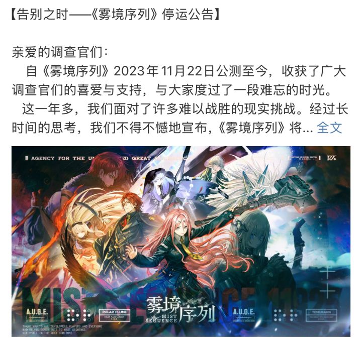 3月27日,《雾境序列》在wb等平台宣布停运,将于2025年5月27日12:00正式停运,由上海星线网络研发的二次元即时战略手游(RTT)*停运时间:1.充值关闭:2025年3月27日12:00,关闭全平台充值功能;2.下载关闭:2025年4月10日前 ,下架各游戏商店及官网下载入口,停止新用户注册;3.正式停运:2025年5月27日12:00,正式停止游戏运营、关闭游戏服务器、官网和论坛