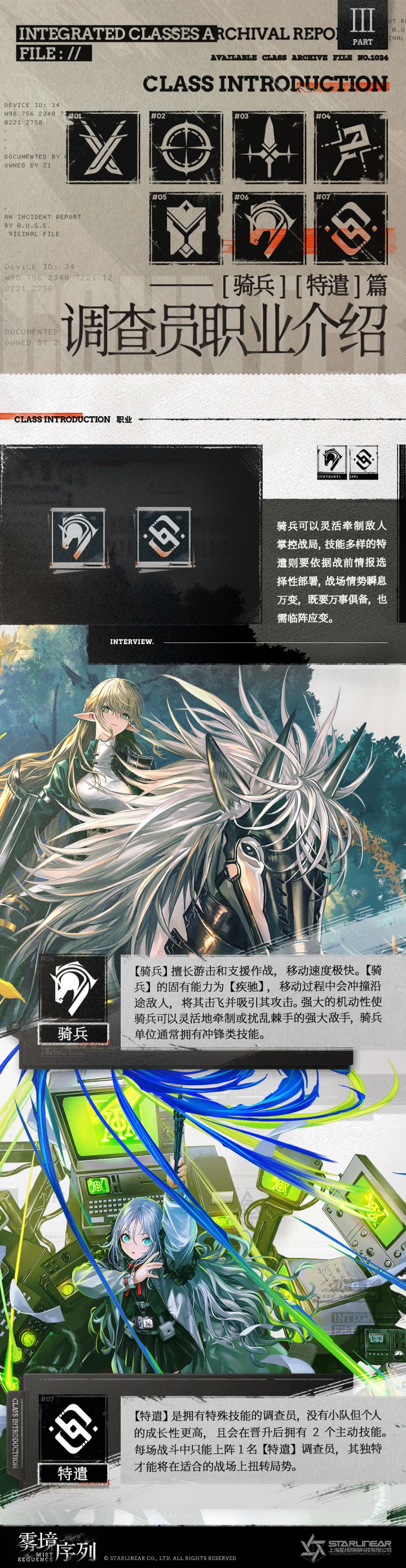 █ 调查团基础档案库 █ >>>文献检索 - 骑兵、特遣简介本页内容将继续帮助您了解麾下调查员的职业特点,请仔细阅读。骑兵具备极高的移动速度,可以灵活牵制敌人掌控全局。技能多样的特遣则要依据战前情报选择性部署。战场情势瞬息万变,通过精巧的操作发挥调查员们的特点,往往可以成为改变战局的神来之笔。____________▶▶立即预约◀◀《雾境序列》复古未来幻想×即时战术SRPG ——以理